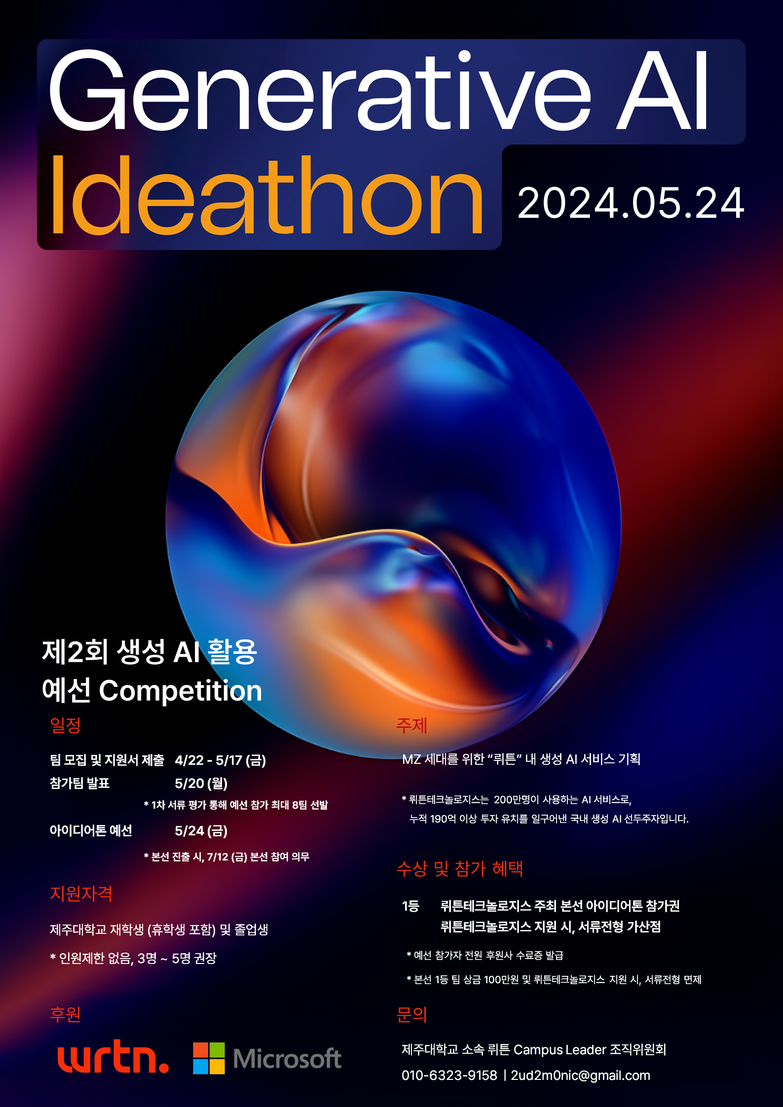 | 414 | 뤼튼 아이디어톤 참가자 모집 안내 | 2 | 화학코스메틱스학과 | 2024-05-09 | 1517 |